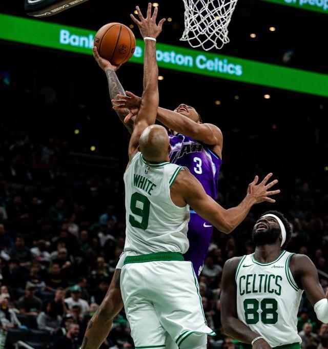 北京时间11月4日,犹他爵士以105-103逆转波士顿凯尔特人。这场比赛绿凯在主场一度领先爵士14分之多,但第三节爵士队的基扬特-乔治突然爆发,末节两队比分交替领先鏖战至最后一刻,努尔基奇0.6秒准绝杀,布朗进攻犯规比赛完结。